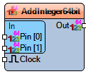 The **Add Integer (Int64)** component sums all connected 64-bit integer inputs and produces the total at its output. An optional **Clock** input can be used to control when the sum is updated — if connected, the sum is recalculated only on clock pulses. When **Clock** is not used, the sum updates continuously as inputs change. This is useful for accumulation, combining sensor values, or multi-channel arithmetic.