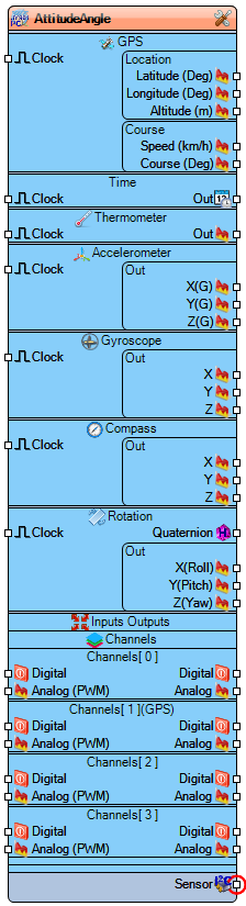 The Attitude Angle JY61P/JY901 component provides 9-axis attitude estimation with accelerometer, gyroscope, compass, and GPS integration. It communicates using the I2C interface and outputs comprehensive orientation, position, and motion data.