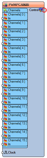 The NXP PWM PCA9685 component provides 16-channel PWM output control through I2C communication. It allows precise control of multiple PWM signals with configurable frequency and output settings.