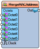 The **Merge Octets To Text MAC Address** component combines six input octets into a single string formatted as a standard MAC address (e.g., `00:1A:2B:3C:4D:5E`). Each octet is provided as a separate input, and the full address is updated when triggered by the **Clock** pin. An initial default address can be set using the **Initial Value** property.