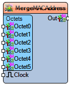 The **Merge Octets To 64-bit Unsigned MAC Address** component constructs a MAC address by merging six octet inputs into a single 64-bit unsigned integer. The merge is triggered by the **Clock** input. This is useful for generating or reconstructing MAC addresses from their separate byte components.