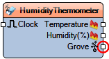 The **Grove Temperature & Humidity Sensor (DHT11)** component measures both ambient temperature and relative humidity. It supports temperature output in either Celsius or Fahrenheit, depending on the **In Fahrenheit** property. The sensor is triggered via the **Clock** pin, and outputs the readings as analog signals for temperature and humidity.