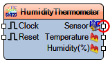 The **Humidity and Thermometer Sensirion SHT20** component provides precise temperature and humidity readings. It communicates via the I²C bus and supports multiple resolution settings for temperature and humidity measurements. A **Reset** pin allows the sensor to be reset via a digital input.