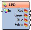 The RGBW LED integrates four LEDs (red, green, blue, and white) into a single package. It extends the capabilities of a standard RGB LED by adding a dedicated white channel for improved brightness and natural white tones. The component can be driven with a color input signal and configured with an initial value and inverted logic option.